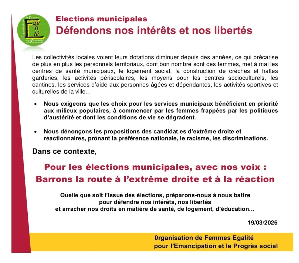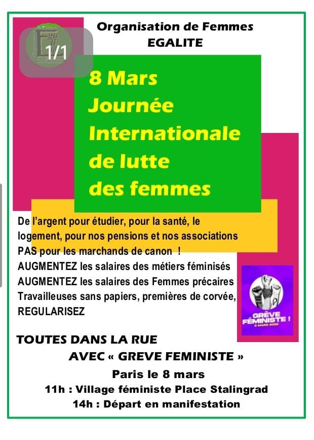 SUCCES DU 8 MARS 2026 Grand succès des manifestations du 8 mars. Les manifestations ont réunis 130 000 personnes à Paris et plus de 200 000 dans tout le pays. Mobilisation unitaire lancée par « Grève Féministe » Essentiellement FEMINISTE, ANTIFASCITE, CONTRE LA GUERRE ET POUR LA SOLIDARITE INTERNATIONALE AVEC LES FEMMES DES PEUPLES DU MONDE ENTIER. Les militantes de Femmes Egalité étaient présentes dans plusieurs villes: Paris, Grenoble, Villefranche, Lyon et Bordeaux.