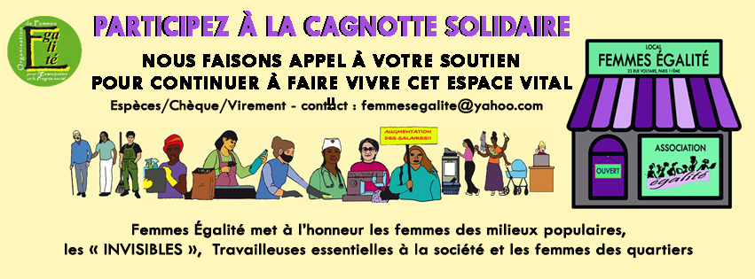 Retrouvez toutes les infos sur Grève fémnisite et les visuels sur notre Facebook Femmes Egalité se réjouit que la motion de retrait de la proposition de loi du RN ait été adoptée aujourd'hui à une large majorité. Femmes Égalité continuera à se battre avec détermination pour la régularisation des sans papiers, à commencer par les travailleuses!